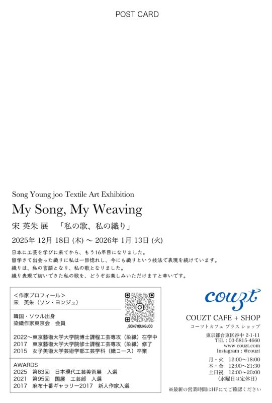“My Song, My Weaving” Song Young joo Textile Art Exhibition 宋 英朱 展「私の歌、私の織り」 ...2025/12/08...