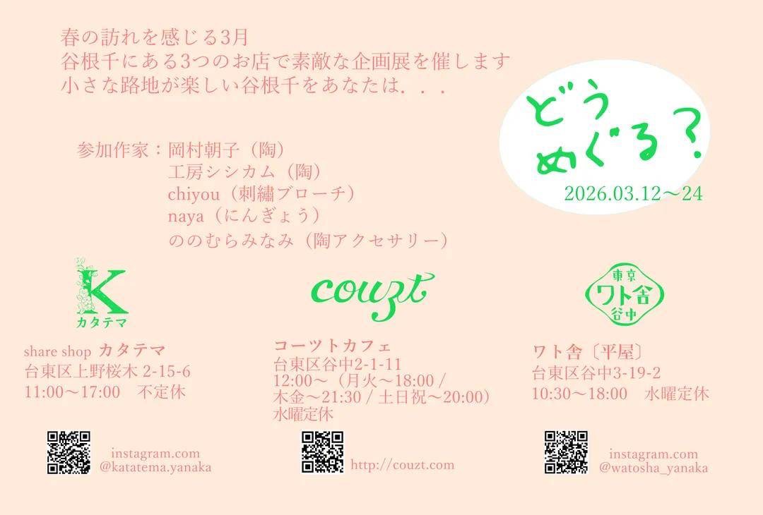 作家5組×3店舗 合同展「どうめぐる?」岡村朝子、工房シシカム、chiyou、naya、ののむらみなみ ...2026/02/14...